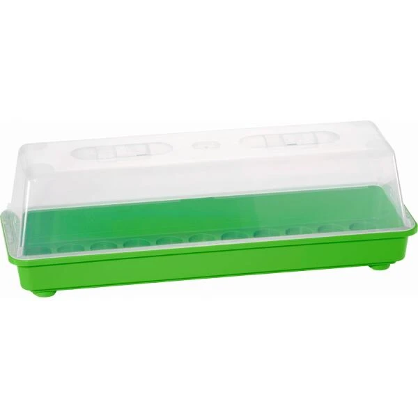 De kas past perfect op de vensterbank, schuifjes in het deksel zorgen voor een goede ventilatie en condenswater loopt langs het deksel terug naar de bodem zonder te druppelen. Extra openingen aan de zijkant van het deksel zorgen ook voor de aanvoer van verse lucht.